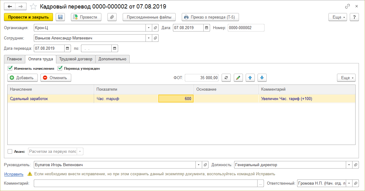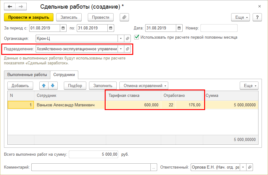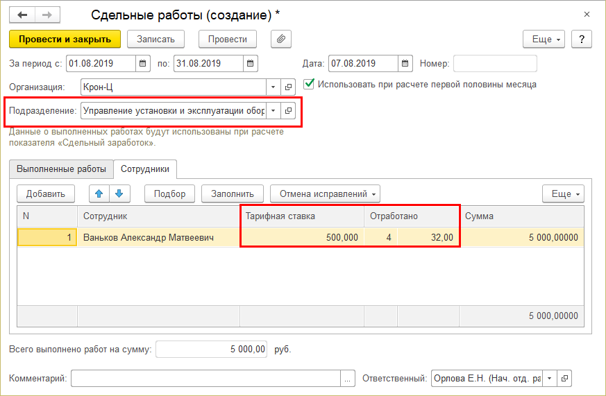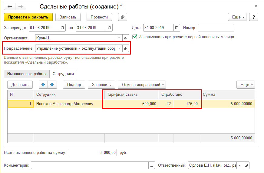 Теперь объем отработанного времени и размер тарифной ставки сотрудника заполняются с учетом подразделения, выбранного в шапке документа: