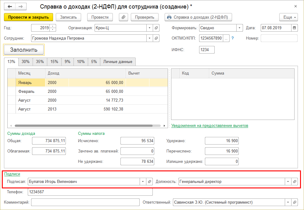 Реализовано автоматическое заполнение подписанта в справке 2-НДФЛ для сотрудников. Заполняется руководитель, указанный в ответственных лицах организации.