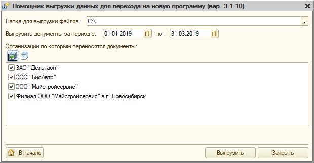 При его выборе нужно указать период и организации, по которым необходимо перенести сведения.
