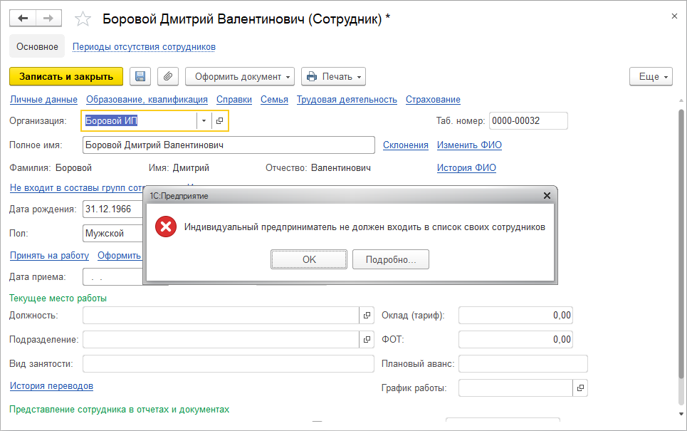 Добавлена проверка, не позволяющая оформить физическое лицо, являющееся индивидуальным предпринимателем, в качестве сотрудника у самого же себя (согласно пояснениям Роструда).