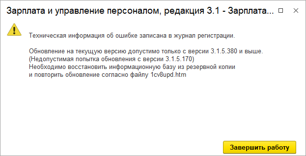 Если версия вашей конфигурации ниже 3.1.5.380 (от 29.12.2018), то при попытке обновления сразу на текущую версию 3.1.10, после запуска базы в режиме Предприятие будет выдано сообщение: