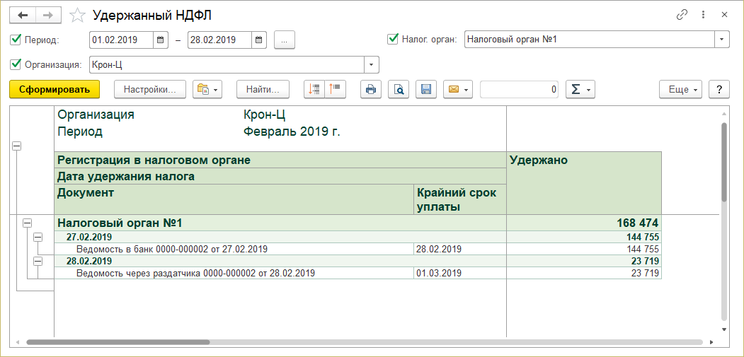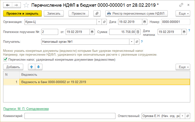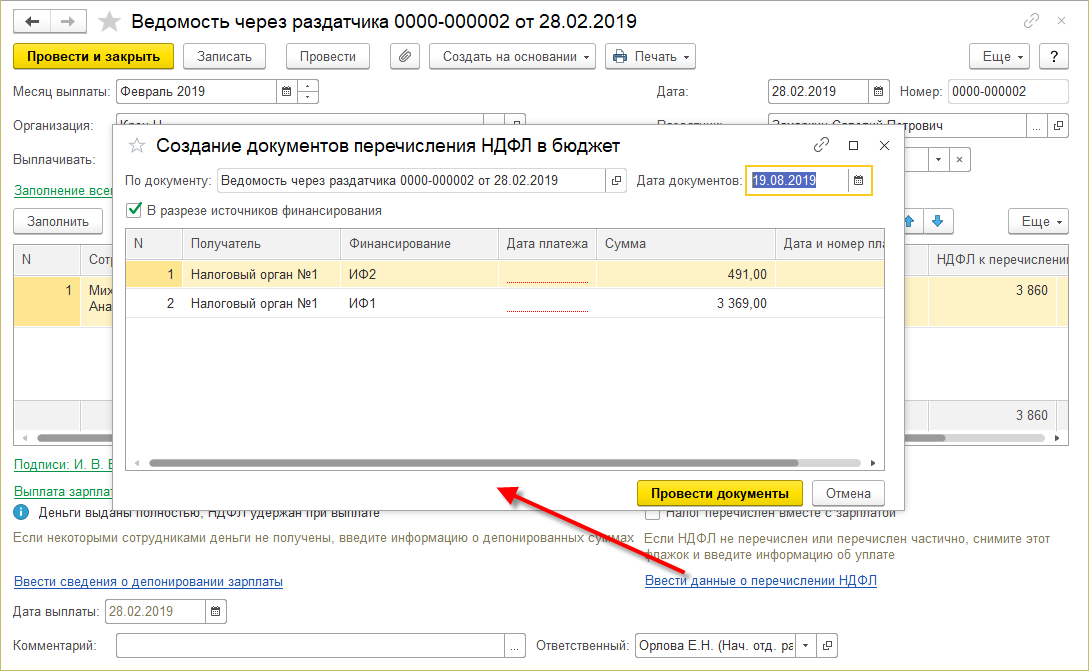 По ссылке "Ввести данные о перечислении НДФЛ" из ведомости можно создать сразу несколько документов "Перечисление НДФЛ в бюджет".