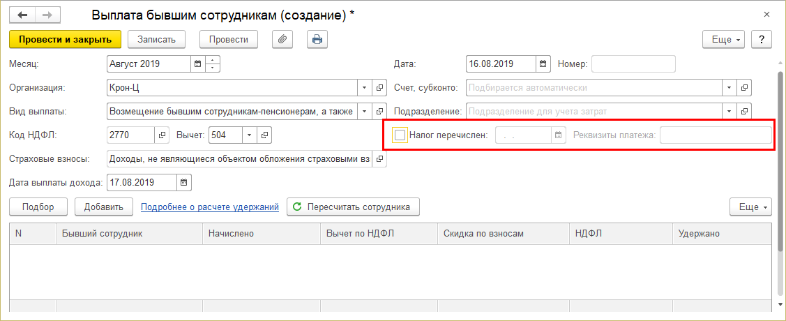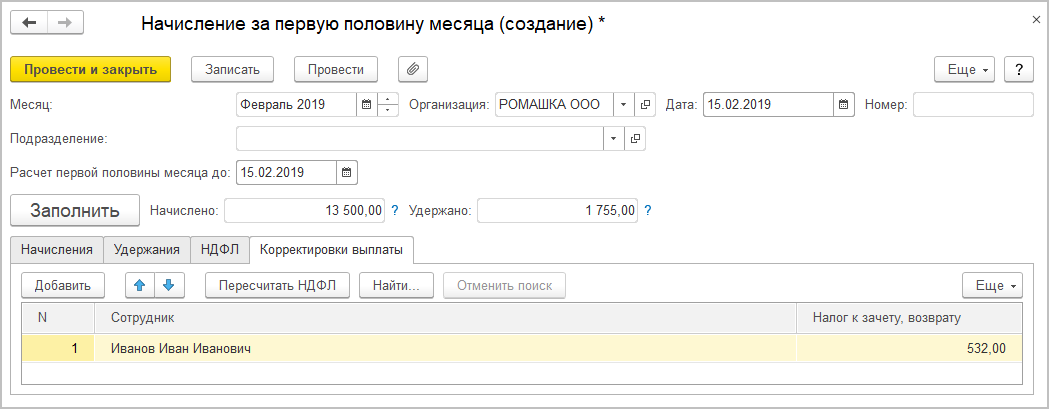 Необходимо учитывать, что возможность исчисления НДФЛ к зачету в межрасчетных документах реализована только для ситуации, когда при расчете такого межрасчетного документа происходит уменьшение облагаемой базы. Если исчисление налога к зачету требуется, например, в связи с необходимостью предоставления вычетов за прошлые месяцы налогового периода, как и ранее, налог к зачету будет исчислен при окончательном расчете документом Начисление зарплаты и взносов или документом Перерасчет НДФЛ.