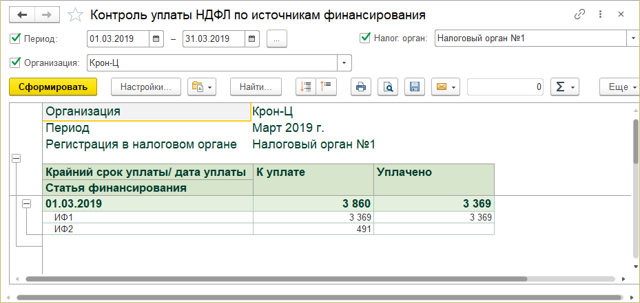 Информацию о суммах перечисленного налога в разрезе источников финансирования можно получить с помощью отчета "Контроль уплаты НДФЛ по источникам финансирования", а также доступен отчет "Удержанный НДФЛ по источникам финансирования".