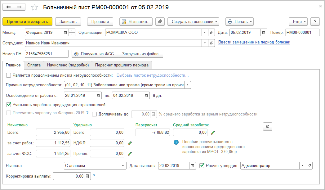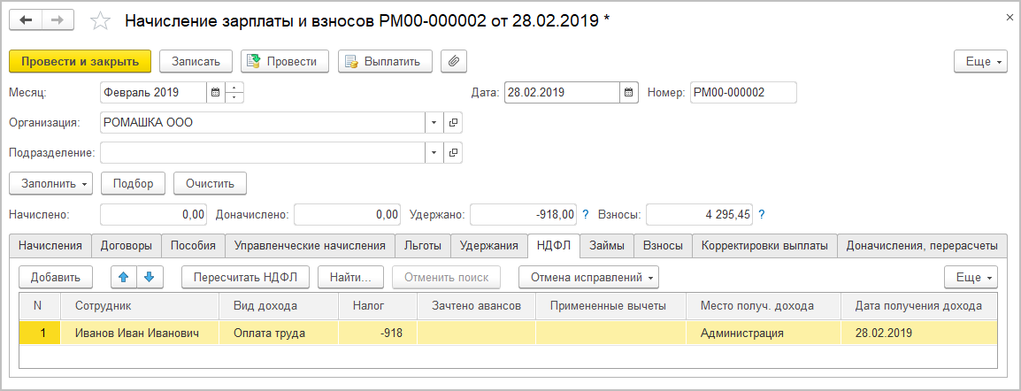 Если дата начала периода, за который рассчитывается начисление, приходится не на месяц, в котором выполняется расчет, место получения дохода заполняется исходя из подразделения и территории, где работал налогоплательщик по состоянию на конец месяца, в котором выполняется расчет, на рисунках ниже – по состоянию на 28.02.2019. При этом место получения дохода при необходимости может быть отредактировано: