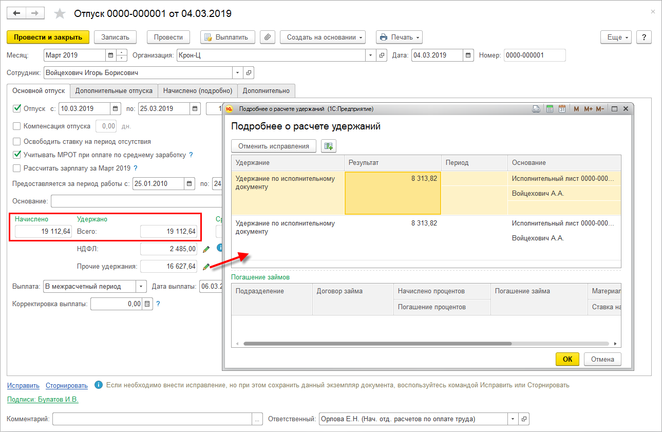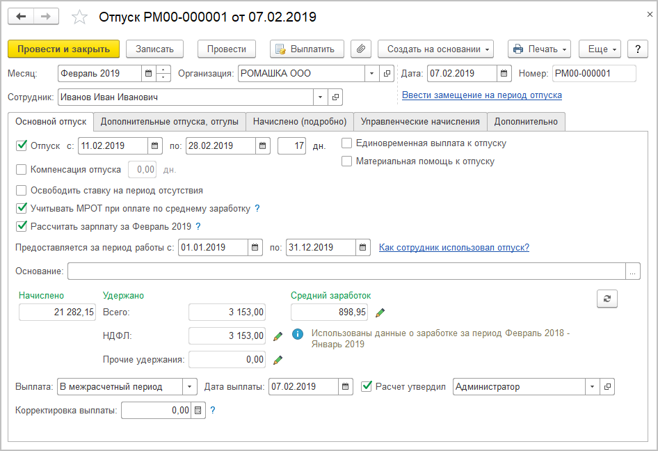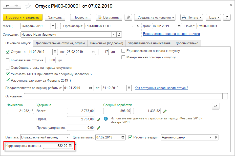 Также обращаем внимание, что если предварительный расчет выключен, то при проведении отпуска кадровиком он не фиксируется в расчете остатков отпусков. В этом режиме он будет зафиксирован только после расчета и проведении документа расчетчиком.