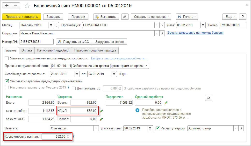 В версии 3.1.10 в такой ситуации уже при расчете больничного листа исчисляется налог к зачету с одновременной корректировкой суммы к выплате: