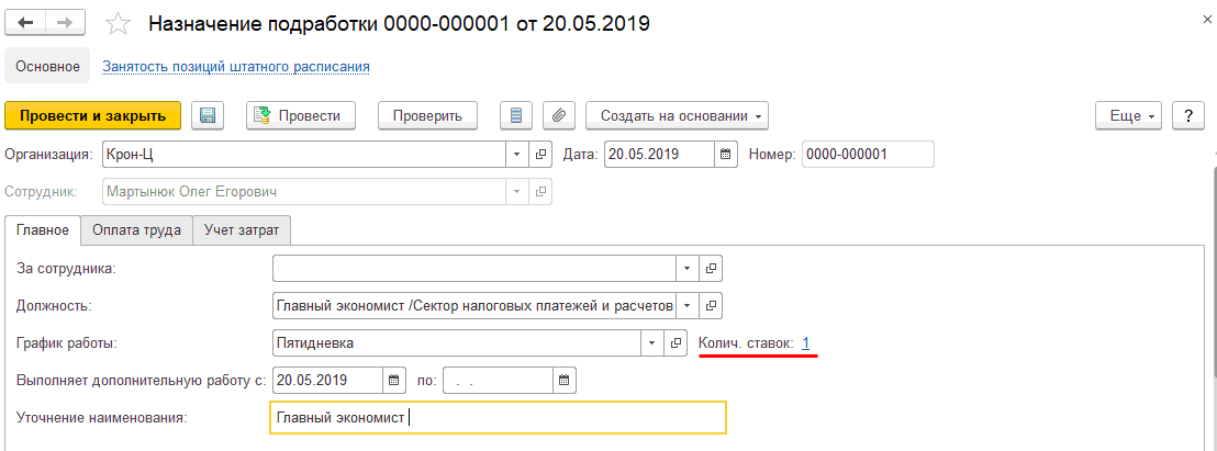 В документе "Назначение подработки" количество ставок указывалось и ранее, но начиная с версии 3.1.10 это количество ставок считается занятым: