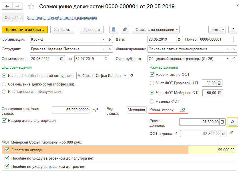 В документ "Совмещение должностей" добавлено новое поле "Количество ставок":