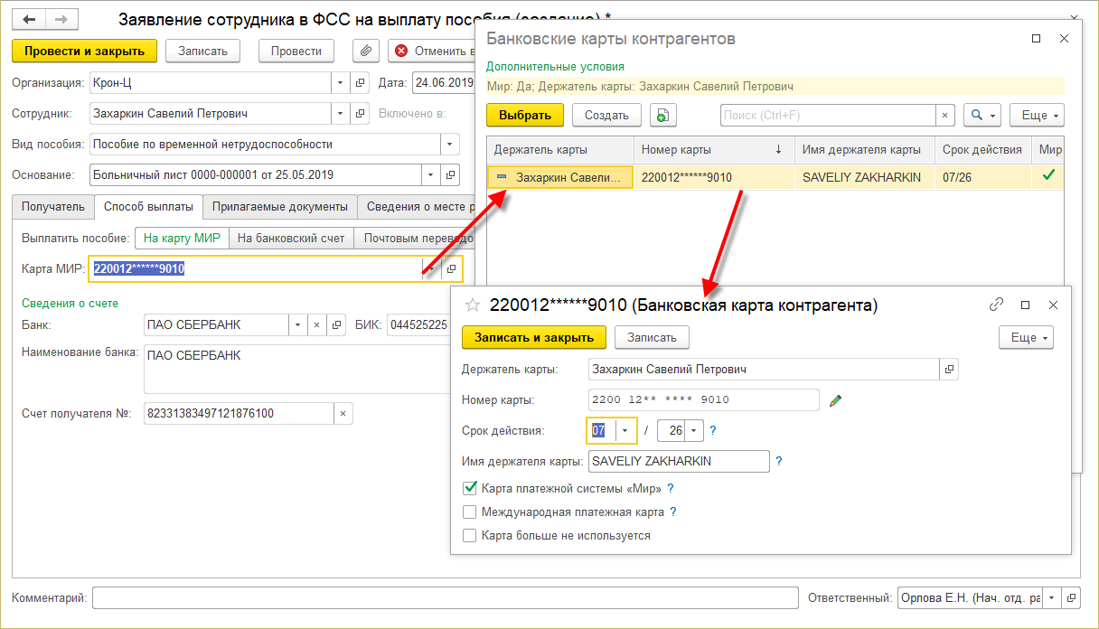 В заявлении сотрудника на выплату пособия реализована возможность выбора карты МИР из нового справочника банковских карт, вместо прежней возможности ввода номера непосредственно в поле.