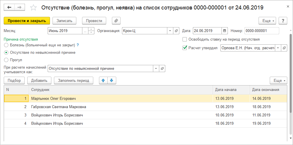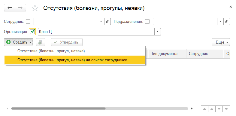 Добавлен документ "Отсутствие (болезнь, прогул, неявка) на список сотрудников".