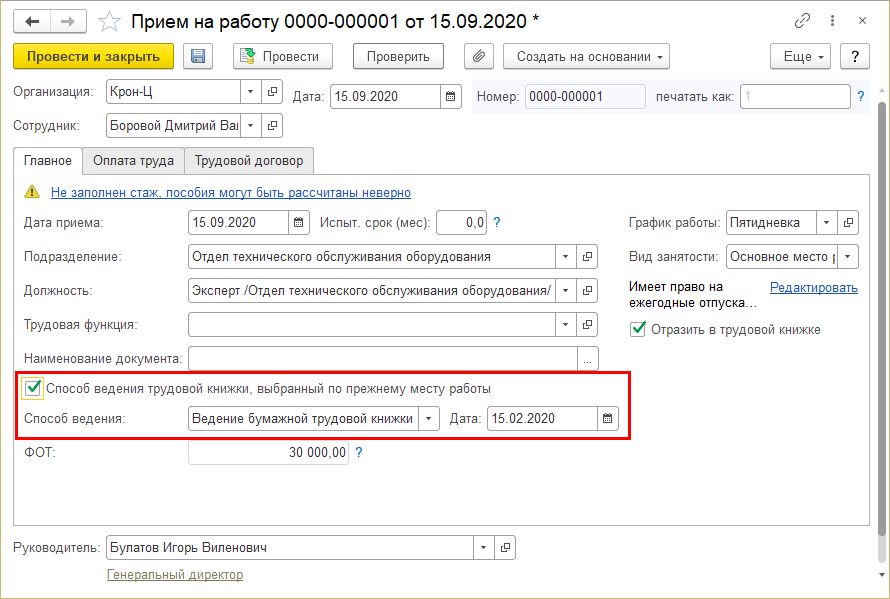 Реализована возможность указать выбранный на предыдущем месте работы способ ведения трудовой книжки и дату поданного заявления при оформлении приема на работу.