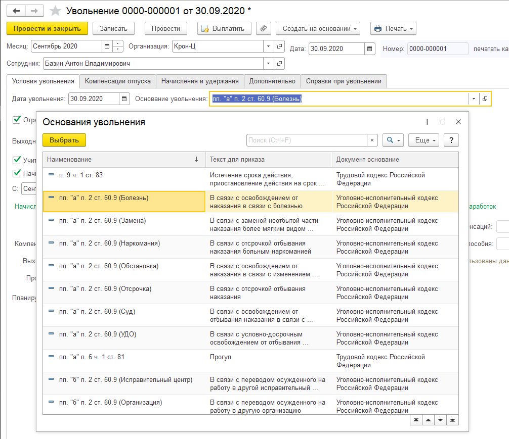 По просьбам пользователей добавлены основания увольнения в соответствии с федеральным законом "Об альтернативной гражданской службе" и Уголовно-исполнительным кодексом РФ.