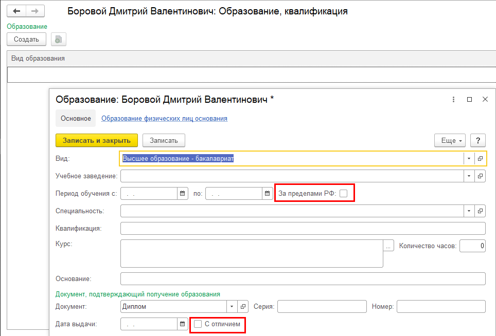 В сведения об образовании добавлен признак для диплома "с отличием" и об обучении за пределами РФ.