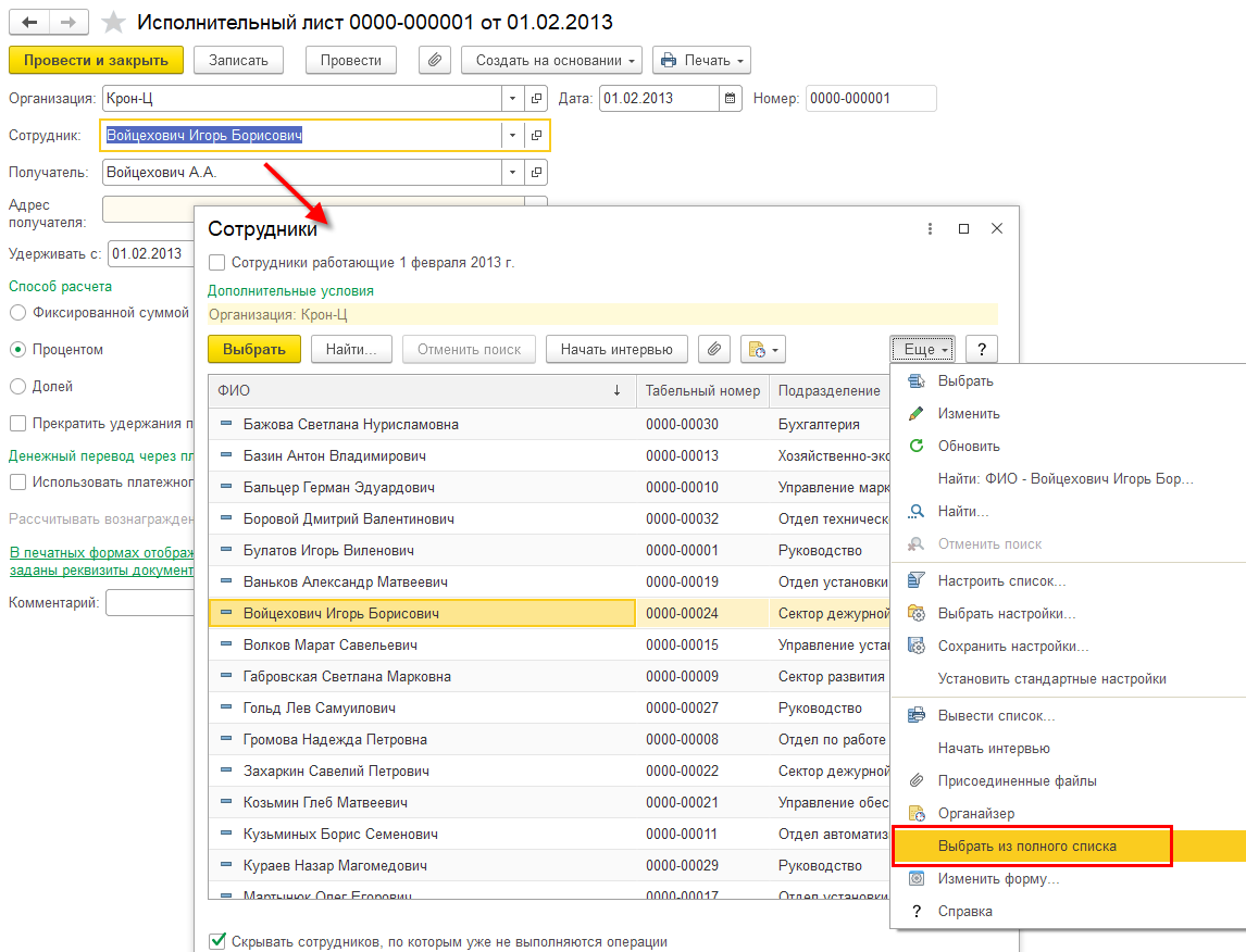 В некоторых документах (например, "Исполнительный лист") при выборе сотрудника добавлена возможность выбрать договорника ГПХ (меню Еще – Выбрать из полного списка).