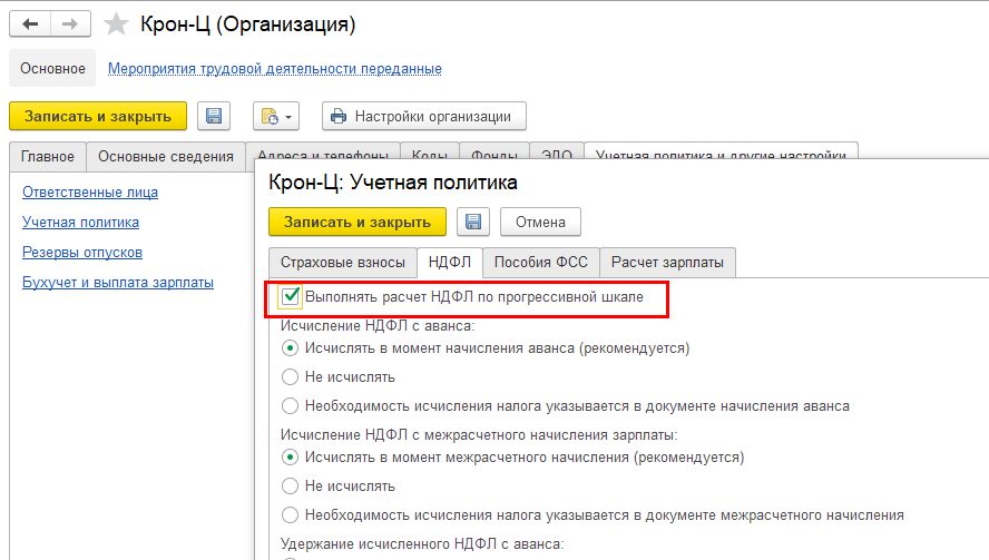 Реализован расчет НДФЛ по прогрессивной шкале с 2021 года согласно Федеральному закону от 23.11.2020 № 372-ФЗ. Для выполнения расчета по прогрессивной шкале необходимо включить настройку "Выполнять расчет НДФЛ по прогрессивной шкале" в учетной политике организации на закладке НДФЛ.