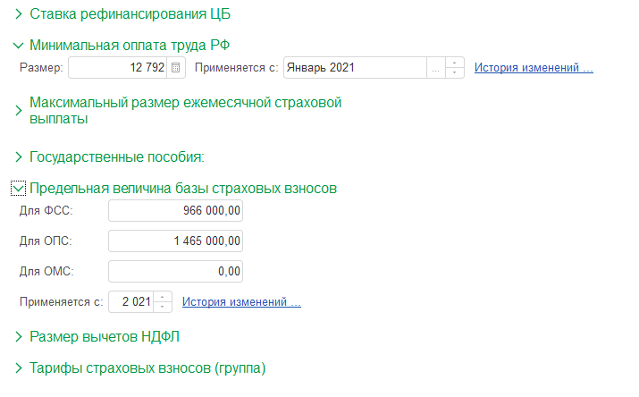 Добавлены новые предельные величины облагаемой базы для начисления страховых взносов в ПФР и ФСС на 2021 год, в соответствии с Постановлением Правительства РФ от 26.11.2020 № 1935.