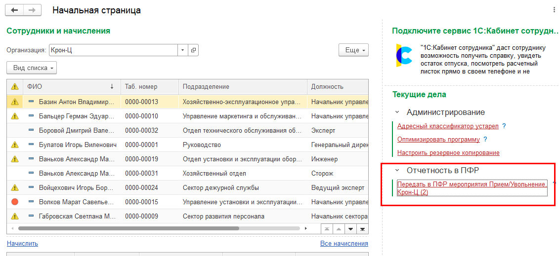 Напоминание формируется в разделе "Текущие дела" начальной страницы программы на следующий день после оформления приказа о приеме или увольнении, если он не был отправлен в ПФР.