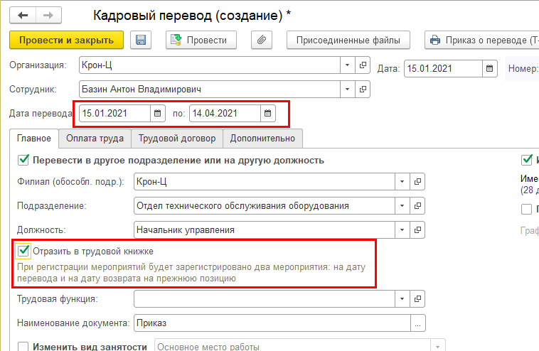 Добавлена возможность регистрировать для трудовой книжки временные (срочные) кадровые переводы.