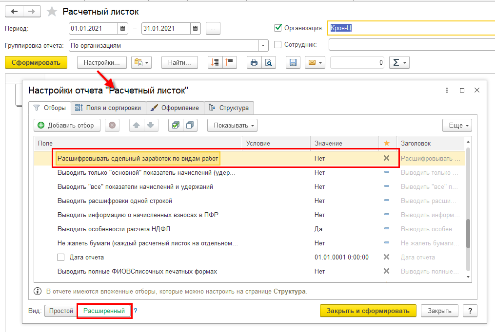 В расчетном листке настройка "Расшифровывать сдельный заработок по видам работ" перенесена в расширенные (из быстро доступных) в связи с ее ограниченными возможностями.