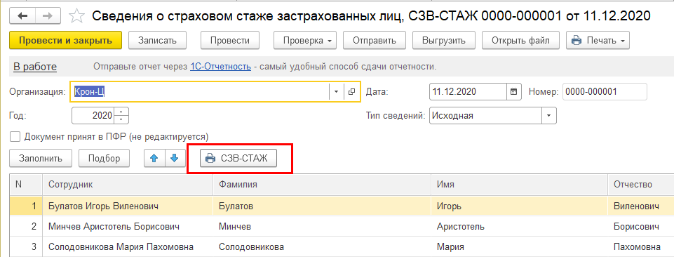 Добавлена возможность сформировать "выписку" из СЗВ-СТАЖ по выбранному сотруднику, т. е. печатную форму на одного сотрудника. Форма печатается по кнопке "СЗВ-СТАЖ" над таблицей сотрудников в документе.