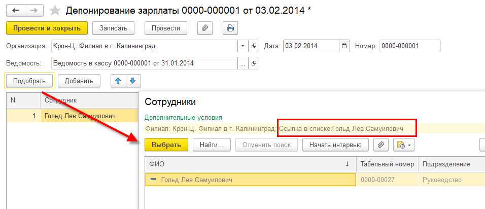 В документе "Депонирование зарплаты" сотрудники теперь выбираются только из числа присутствующих в депонируемой ведомости, а не из всего списка сотрудников.