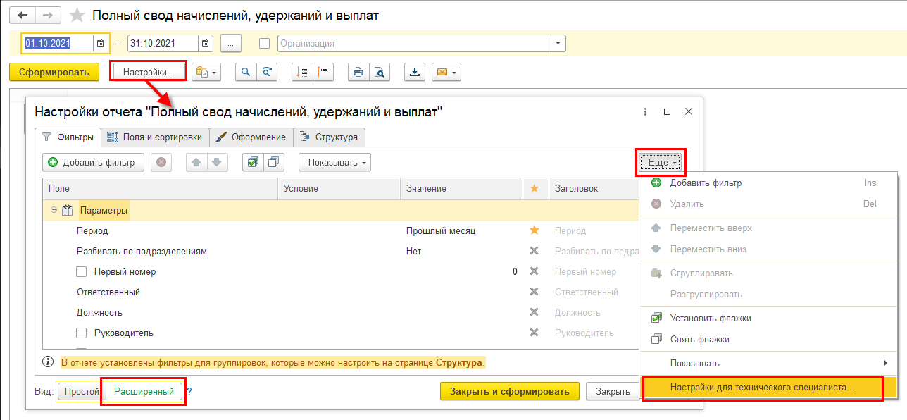 Пункт меню формы отчета Еще - Прочее - Изменить вариант отчета… перенесен в форму расширенных настроек отчета в Еще - Настройки для технического специалиста….