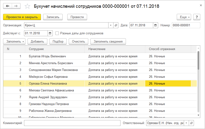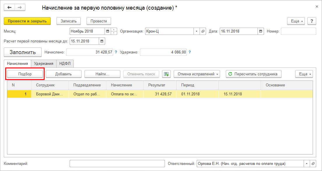 В документе "Начисление за первую половину месяца" добавлена возможность заполнения сотрудников подбором.