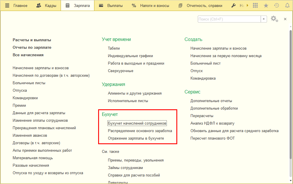 В разделе Зарплата выделен новый подраздел Бухучет, включающий в себя все документы бухучета.
