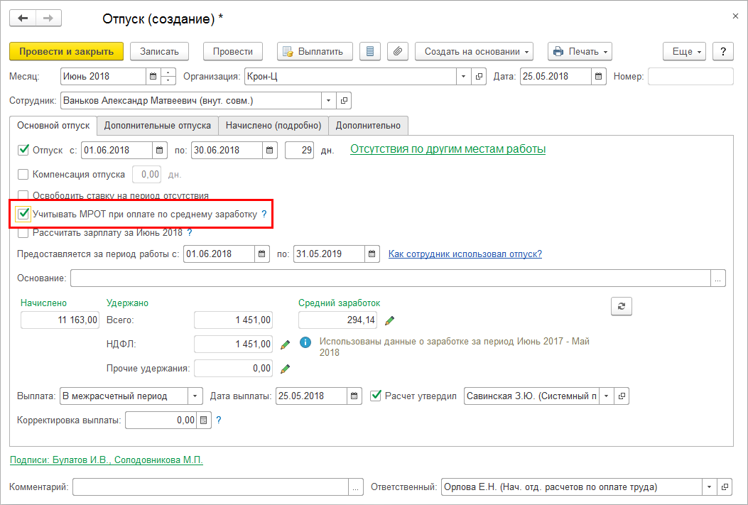 Во все документы с оплатой по общему среднему заработку (отпуск, командировка и т.п.) добавлен флажок "Учитывать МРОТ при оплате по среднему заработку".