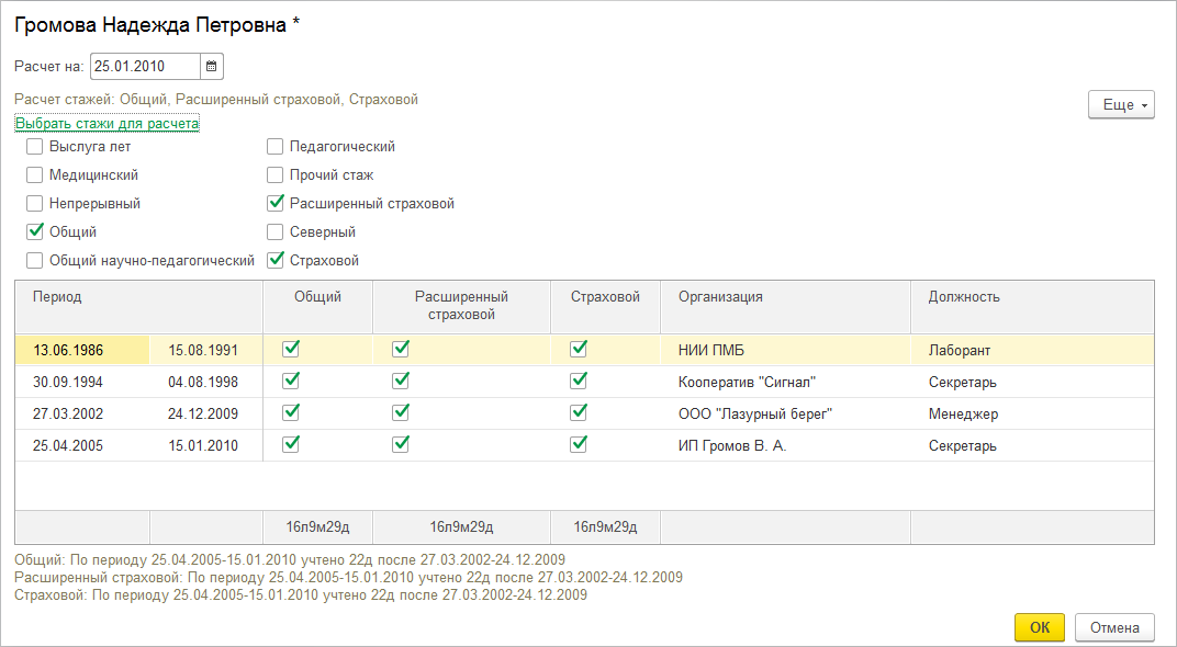 Реализована возможность автоматического расчета стажей сотрудника согласно сведениям об его прошлой трудовой деятельности. Калькулятор открывать по кнопке "Рассчитать стажи" над таблицей с трудовой деятельностью.