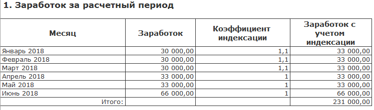 Например, сотрудник принят в январе с окладом 30 000. С апреля произведена индексация заработка на 10% (коэффициент 1.1) до 33 000. А с июня сотрудник переведен на должность с окладом 66 000.