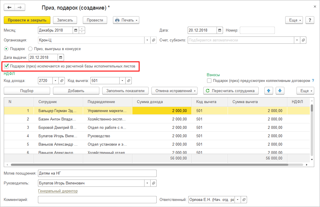А также в конкретном экземпляре документа "Приз, подарок" можно указать, что эту сумму не нужно учитывать при расчете исполнительных листов.
