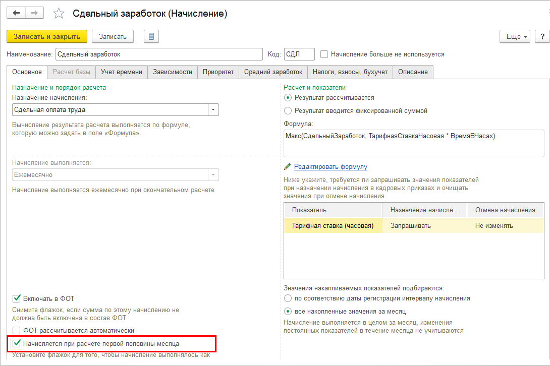 Для этого у начислений с установленной настройкой "Значения накапливаемых показателей подбираются – все накопленные значения за месяц" включена возможность указать, что они начисляются при расчете первой половины месяца.