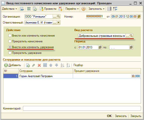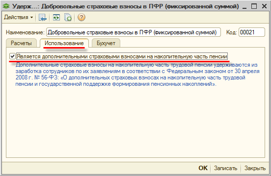 Предположим, что сотруднику (по его обращению к работодателю) назначено плановое удержание "Добровольные страховые взносы в ПФР (процентом)" (у которого установлен соответствующий флаг на закладке "Использование") в размере 30% от заработка