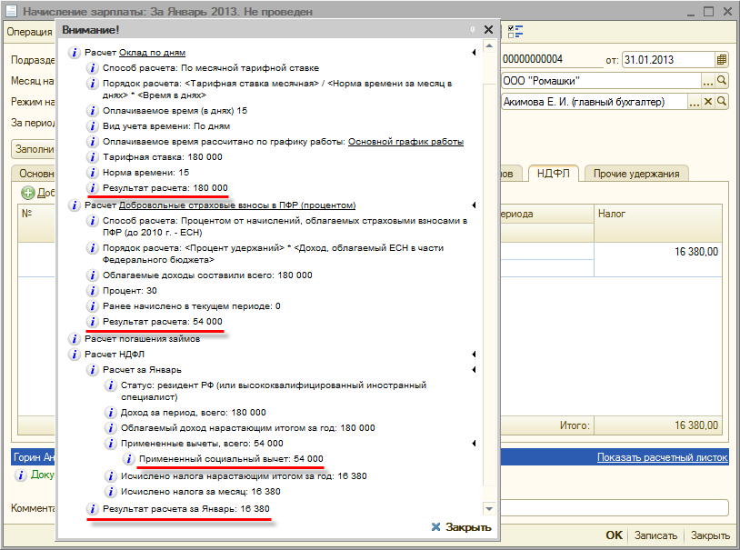 При расчете зарплаты за январь 2013 года сумма начислений составила 180 000 руб. В документе "Начисление зарплаты сотрудникам организаций" рассчитывается удержание добровольных взносов в размере 54 000 руб., регистрируется соответствующий социальный вычет и рассчитывается НДФЛ с учетом этого вычета. В итоге результат расчета НДФЛ составит 16 380 руб., т.е. НДФЛ рассчитан с учетом вычета.