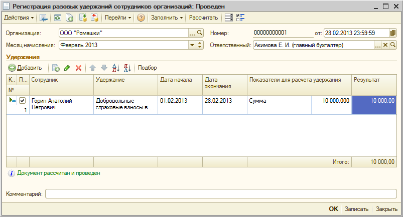 Предположим, что в феврале 2013 года сотрудник обратился с заявлением удержать помимо 30% добровольных взносов дополнительно еще 10 000 руб. добровольных взносов, что было зарегистрировано документом "Регистрация разовых удержаний сотрудников организаций". При проведении документа зарегистрирована необходимость предоставить социальный вычет в размере 10 000 руб.