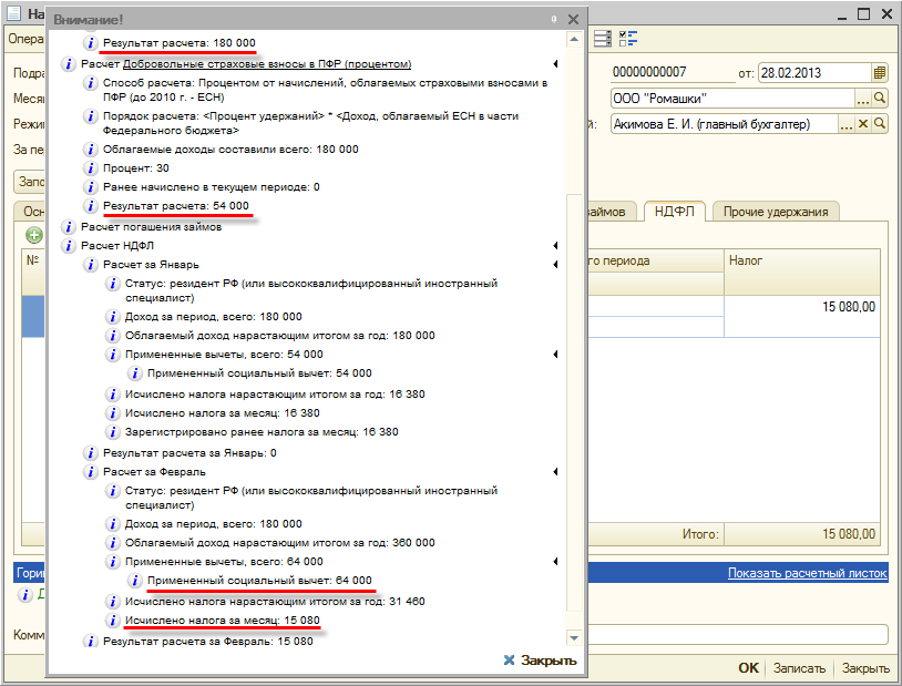 Сумма начислений в феврале 2013 года составила так же 180 000 руб. Но теперь при расчете НДФЛ будет учтен вычет за февраль в размере 64 000 руб. (10 000 руб. добровольных взносов, удержанных "фиксированной суммой" и 54 000 руб., рассчитанных процентом), и результат расчета НДФЛ составит 15 080 руб.