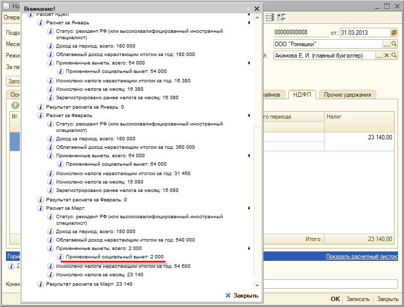В марте 2013 года сумма начислений составила, как и ранее, 180 000 руб., сумма удержания добровольных взносов – 54 000 руб. (разовых удержаний не регистрировалось). Социальный вычет теперь будет зарегистрирован в сумме 2 000 руб., поскольку ранее в течение года он уже был зарегистрирован в размере 118 000 руб., а абзацем третьим п. 2 ст. 219 НК РФ предусмотрено ограничение суммы вычета суммой 120 000 руб. в налоговом периоде.
