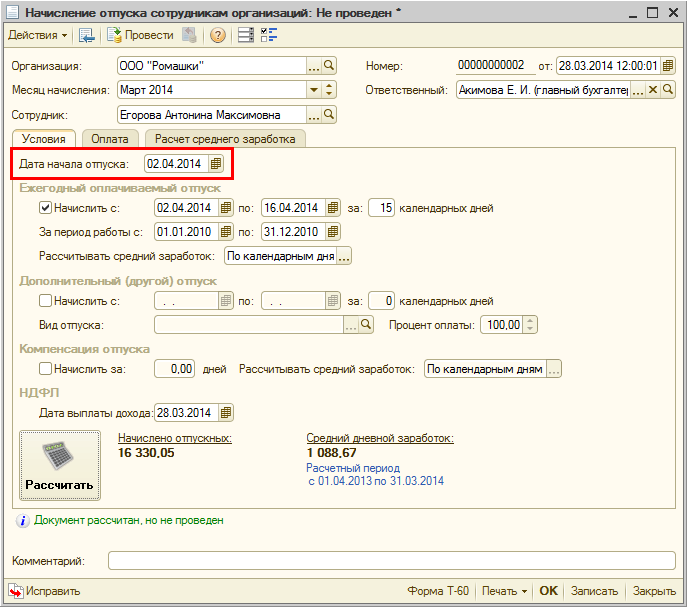 В версии 2.5.79.4 в связи с этим уточнен автоматический расчет среднего заработка. При расчете отпусков, начинающихся со 2 апреля 2014 года включительно, используется новое среднемесячное количество дней 29,3. Для отпусков, начинающихся до 2 апреля 2014 года, используется прежнее количество 29,4. Такой же порядок реализован в документе расчета при увольнении.