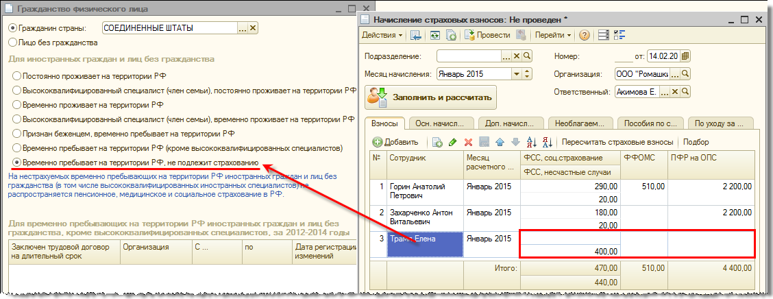 Поскольку теперь взносы за «обычных» временно пребывающих начисляются, в версии 2.5.87 предусмотрен также новый статус «Временно пребывает на территории РФ, не подлежит страхованию».