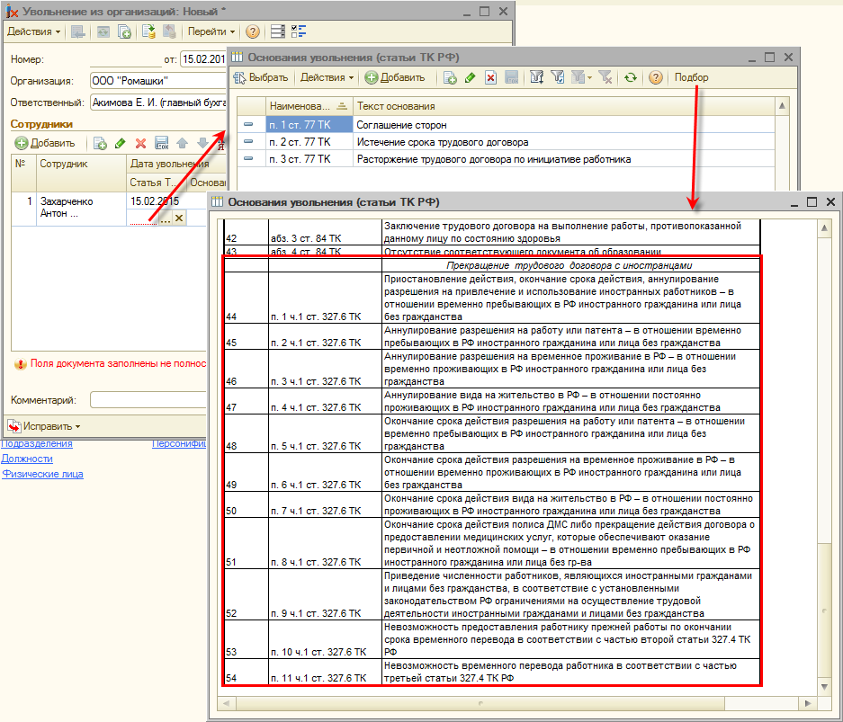 Также отметим другое изменение в отношениях с иностранными гражданами (не связанное со страховыми взносами) отраженное в версии 2.5.87. В соответствии с Федеральным законом от 1 декабря 2014 года № 409-ФЗ перечень оснований увольнения расширен основаниями, актуальными для иностранных граждан.