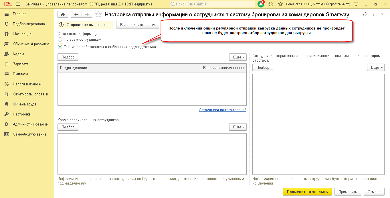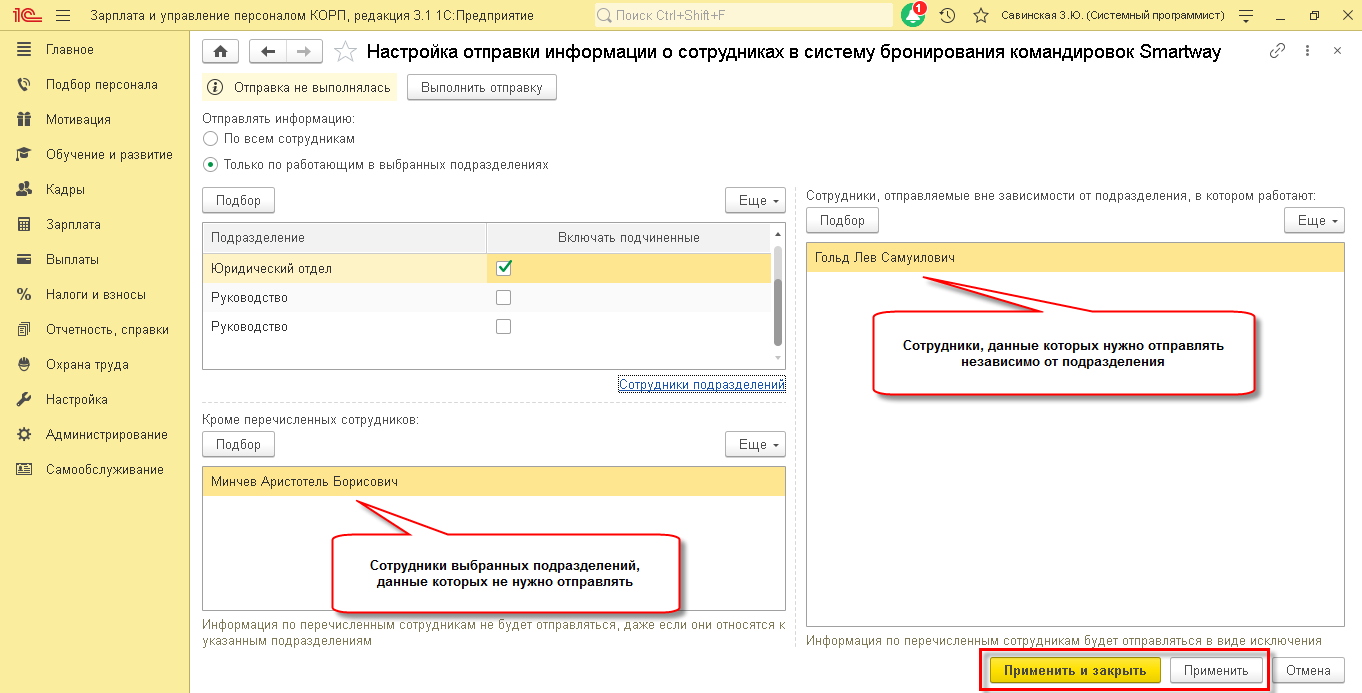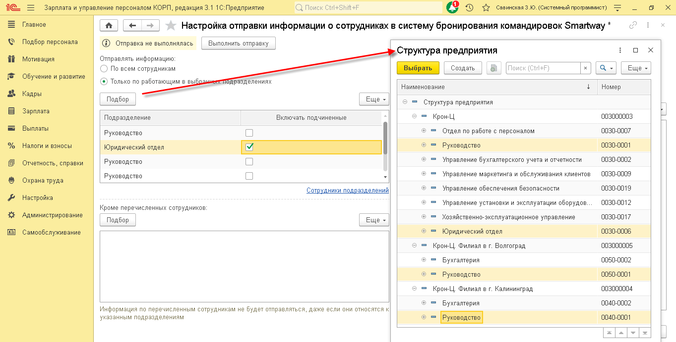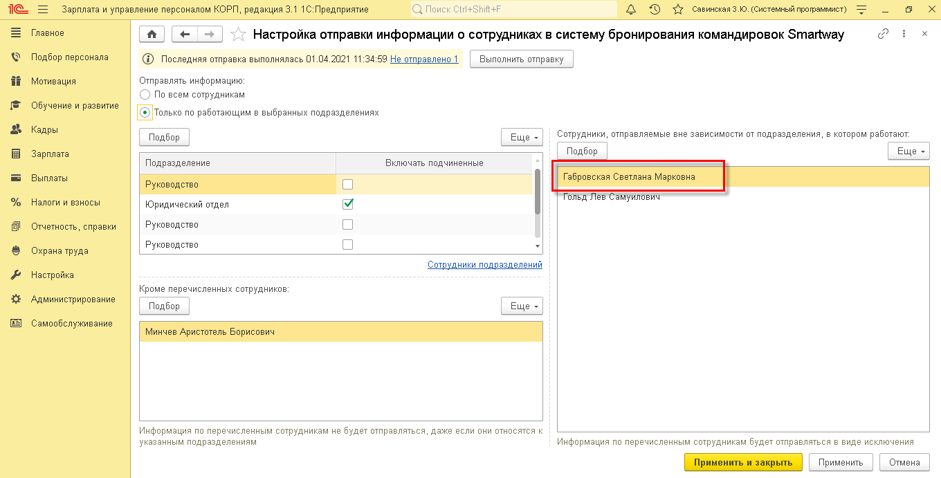 Администратор перечисляет, данные каких сотрудников этих подразделений не нужно отправлять в сервис. И наоборот указывает, данные каких сотрудников должны выгружаться в сервис независимо от их подразделения. После применения правил, выгрузка будет выполняться автоматически в соответствии с установленным отбором подразделений и сотрудников.