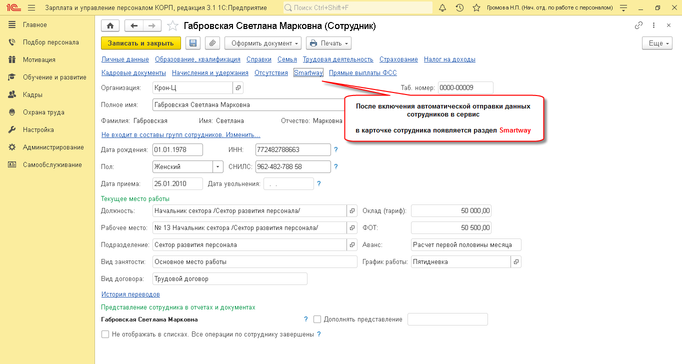 После включения опции регулярной отправки данных сотрудников в сервис в карточках сотрудников появляется раздел Smartway.