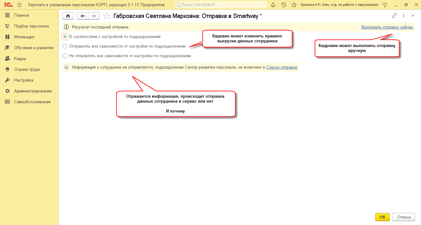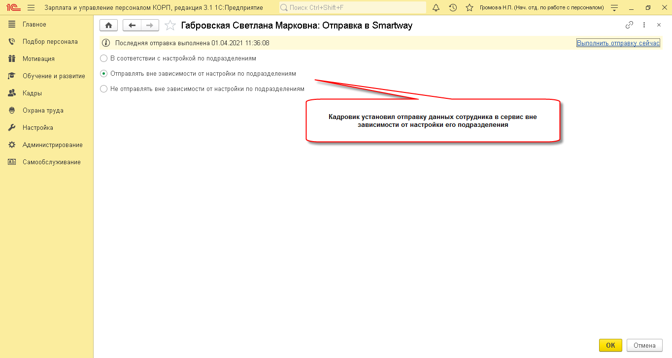 Изменения, внесенные в карточку сотрудника, отражаются в настройках отправки информации в Smartway.
