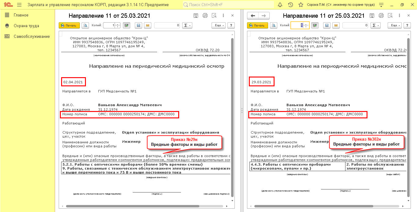 В направлении на медосмотр отражены вредные факторы и виды работ в соответствии с Приказом №29н и №302н (если они ранее были указаны для рабочего места). В направлении появились поля для ввода номеров полисов ОМС и ДМС
