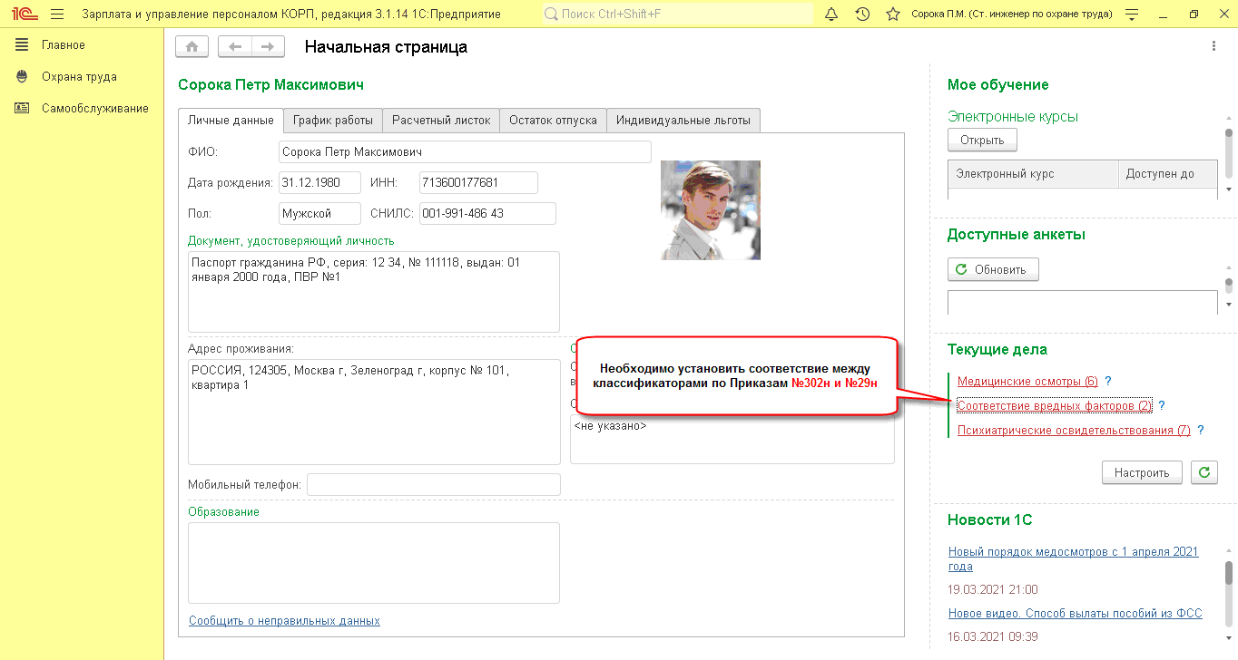 В некоторых случаях после обновления Старший специалист по охране труда может увидеть в списке текущих дел напоминание: Соответствие вредных факторов. Это значит, что необходимо установить соответствие между классификаторами по Приказу №302н и №29н