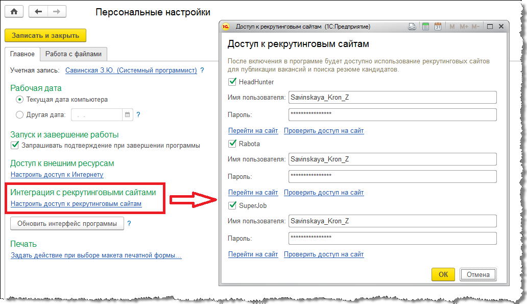 Если в настройках управления персоналом включена опция Использовать интеграцию с рекрутинговыми сайтами и права пользователя предполагают взаимодействие с рекрутинговыми сайтами, в персональных настройках пользователя становится возможным указать параметры подключения.