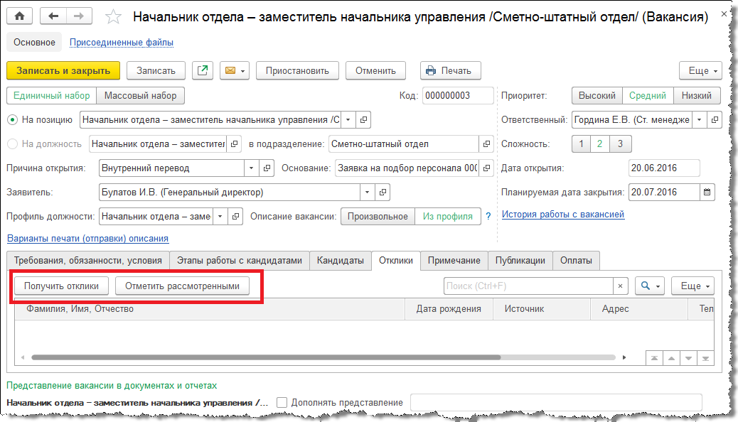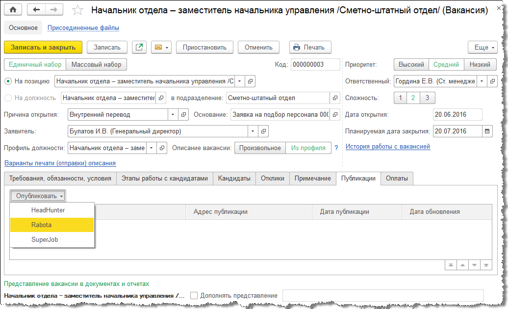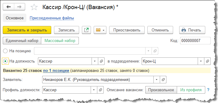 В версии 3.1.4 предусмотрен массовый набор персонала. В карточке вакансии можно указать, что вакансия открыта в рамках массового набора. Такая вакансия может быть открыта не на конкретную позицию штатного расписания, а на указанную должность в указанное подразделение.