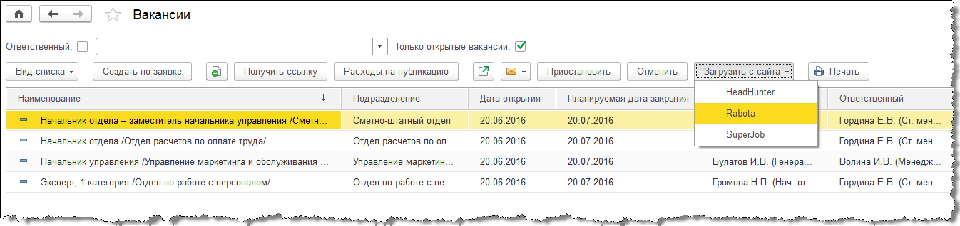 В версии 3.1.4 реализованы возможности подключения к сайту Rabota.ru, размещения и загрузки вакансий, обновления опубликованных вакансий, получения откликов соискателей, поиска и регистрации кандидатов.